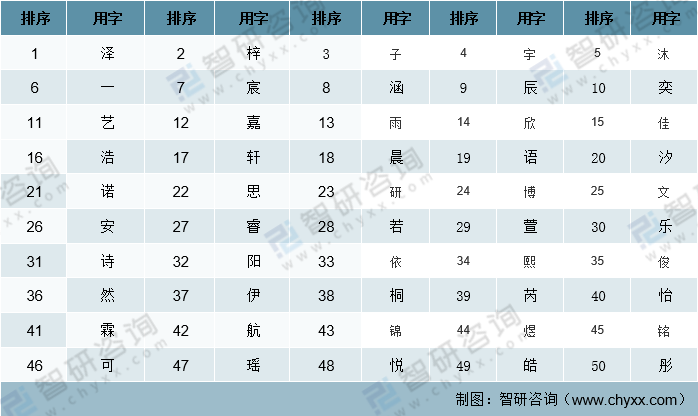 2021年出生并已經進行戶籍登記的新生兒名字中,使用頻率最高的50個字依次為澤、梓、子、宇、沐等。與2020年相比,汐、芮、霖、航等字受到青睞。