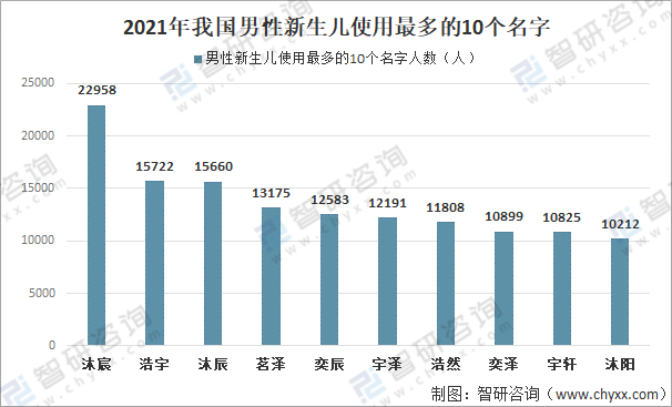 2021年出生并已經進行戶籍登記的男性新生兒中,使用頻率最高的10個名字依次為沐宸、浩宇、沐辰、茗澤、奕辰、宇澤、浩然、奕澤、宇軒、沐陽。與2020年相比,除浩宇、奕辰、宇軒外,其余名字首次進入前十,其中“沐宸”使用人數達到2.3萬,登頂榜首,成為男性新生兒名字首選。