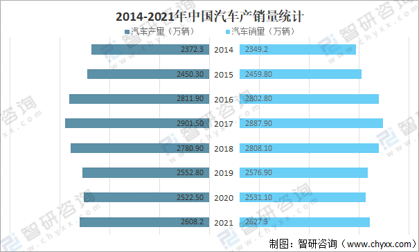 近年來汽車行業已成為我國主導產業之一,產銷量連續多年全球排名第一,2021年中國汽車產量達2608.2萬輛,較2020年增加了85.7萬輛,同比增長3.40%;2021年中國汽車銷量達2627.5萬輛,較2020年增加了96.4萬輛,同比增長3.81%。