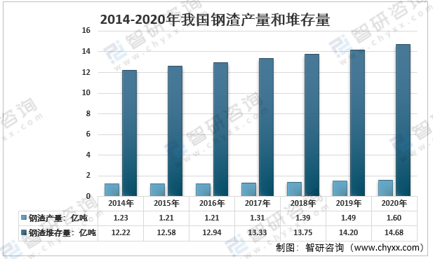 2014-2020年我國鋼渣產(chǎn)量和堆存量