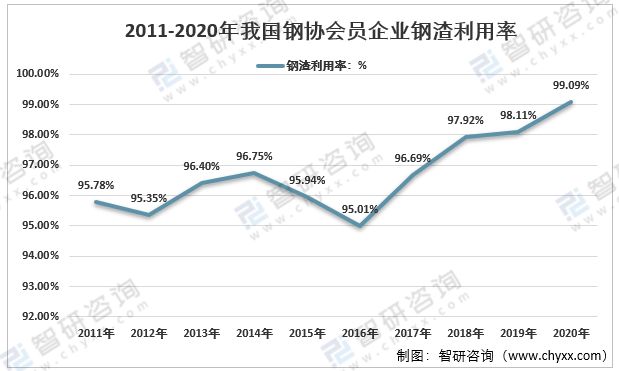 根據(jù)中鋼協(xié)數(shù)據(jù)顯示,2011-2020年我國重點鋼鐵企業(yè)鋼渣利用率不斷上升,2011年為95.78%,2020年全年中鋼協(xié)會員企業(yè)鋼渣利用率達到了99.09%。