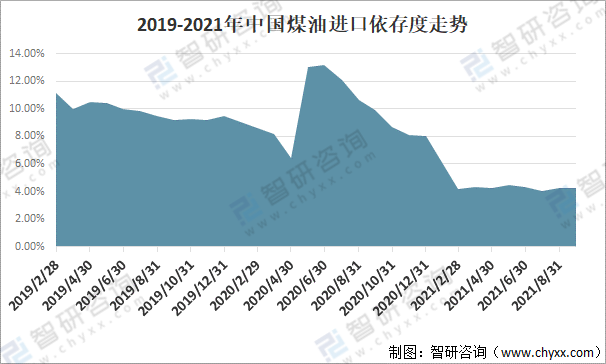 2019-2021年中國煤油進口依存度走勢