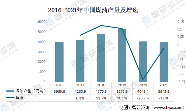 2016-2021年中國煤油產量及增速