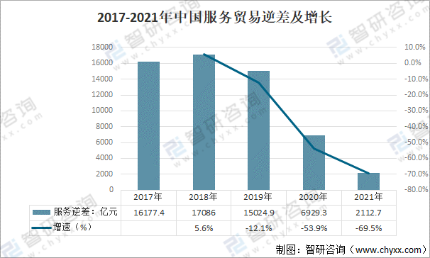 2017-2021年中國(guó)服務(wù)貿(mào)易逆差及增長(zhǎng)