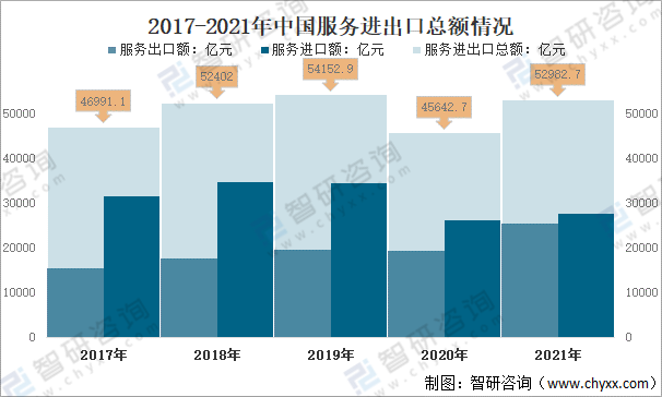 2017-2021年中國(guó)服務(wù)進(jìn)出口總額情況