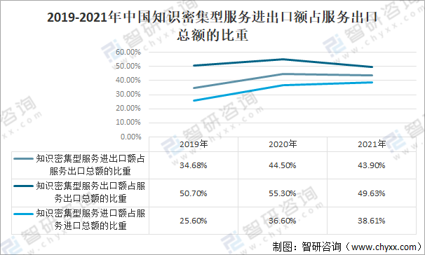 2019-2021年中國(guó)知識(shí)密集型服務(wù)進(jìn)出口額占服務(wù)出口總額的比重