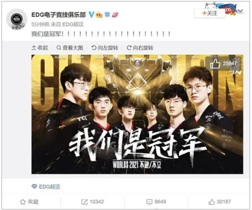 虎牙、B站兩平臺實時直播總決賽的官方直播間人氣值均高達上億,在微博也豪攬數(shù)十個熱搜,騎士精神,在這支屢敗屢戰(zhàn)的隊伍上彰顯得淋漓盡致。許多EDG老粉,終于可以喜極而泣。一時間,朋友圈、微博、抖音……各大社交媒體都在同一時間發(fā)表了祝賀!