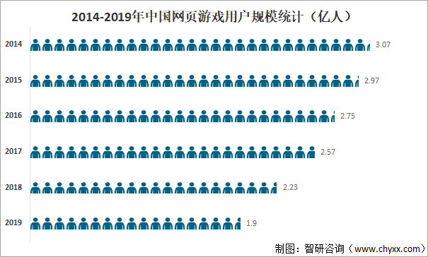 近年來由于用戶逐步向移動游戲轉移,中國網頁游戲的市場份額也在逐年壓縮,近年來中國網頁游戲用戶規模逐年下滑,2019年中國網頁游戲用戶規模為1.9億人,較2018年減少了0.33億人,同比減少14.80%。