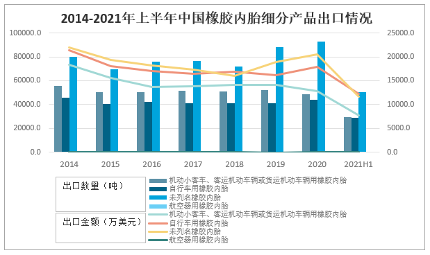 2014-2021年上半年中國橡膠內(nèi)胎細分產(chǎn)品出口情況