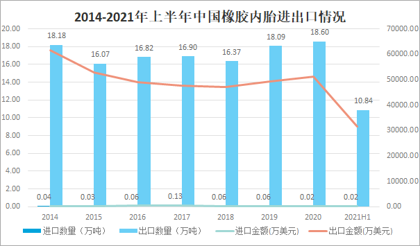 2014-2021年上半年中國橡膠內(nèi)胎進出口情況