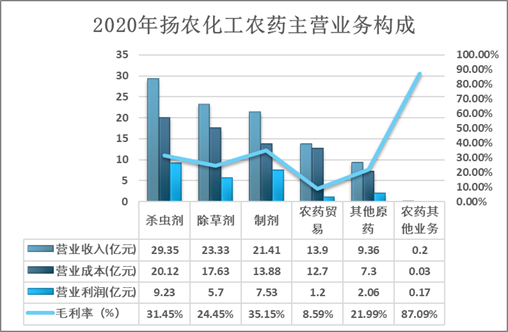 江蘇揚農化工股份有限公司主營農藥產品的研發、生產和銷售。公司的主要產品為殺蟲劑、除草劑、殺菌劑。目前公司已成為全球菊酯領域具有核心優勢的生產企業,菊酯類產品品種數量排名世界前列。2020年揚農化工農藥主營業務構成圖