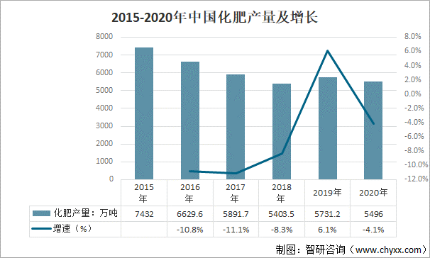 2015-2020年中國化肥產量及增長