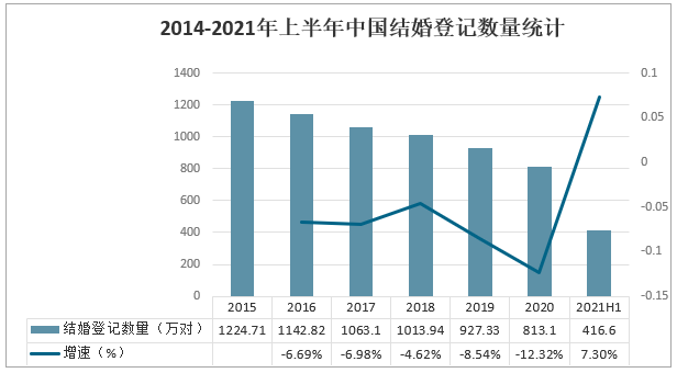 婚慶包括,婚紗攝影,婚宴酒席,婚慶策劃,主持司儀,婚車出租,婚禮跟拍,婚禮攝像,蜜月旅游等相關行業。近年來中國結婚登記數量逐年減少,在2019年跌破了1000萬大關。2020年中國登記結婚對數持續下降,2020年中國共辦理結婚登記813.1萬對,較2019年減少了114萬對,同比減少12.3%。據民政部數據初步統計,2021年上半年全國結婚登記416.6萬對,比上年同期增加28.7萬對。2014-2021年上半年中國結婚登記數量統計