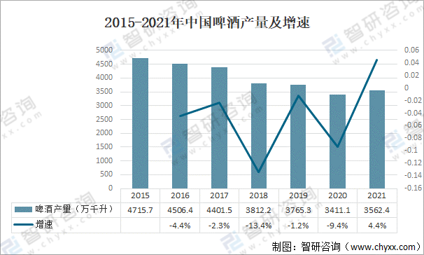 2015-2021年中國(guó)啤酒產(chǎn)量及增速