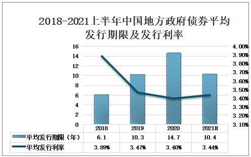 2021上半年中國地方政府債券平均發行期限10.4年;地方政府債券平均發行利率3.44%。