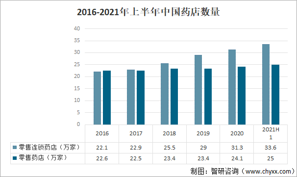 2016-2021年上半年中國藥店數量