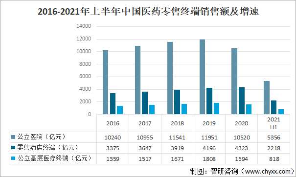 2021年上半年,公立醫院終端市場規模達5356億元,同比增長10.7%;零售藥店終端市場銷售額達2218億元,同比增長6.3%;公立基層醫療終端銷售額達818億元,同比增長4.1%。2016-2021年上半年中國醫藥零售終端銷售額及增速
