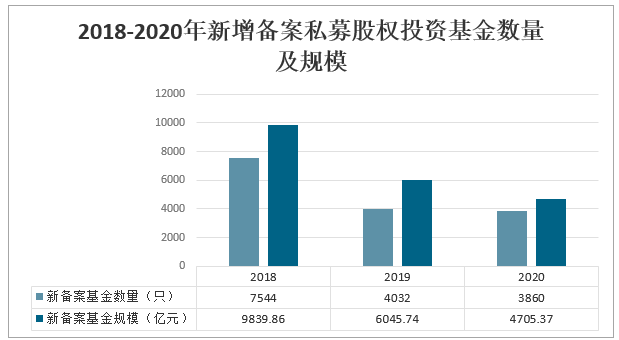 受國際國內復雜經濟形勢、疊加疫情等因素影響,2020年當年新備案私募股權投資基金數量及規模較2019年繼續下降,行業募資環境進一步趨冷。2020年當年新備案私募股權投資基金3860只,較2019年同比下降4.3%;新備案規模4705.37億元,較2019年減少1340.37億元,同比下降22.2%。2018-2020年新增備案私募股權投資基金數量及規模