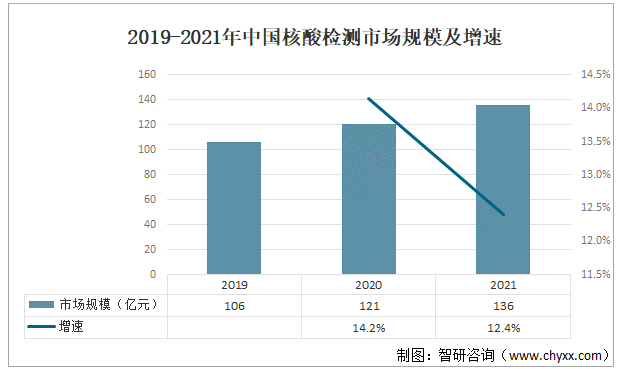 2019-2021年中國核酸檢測市場規模及增速