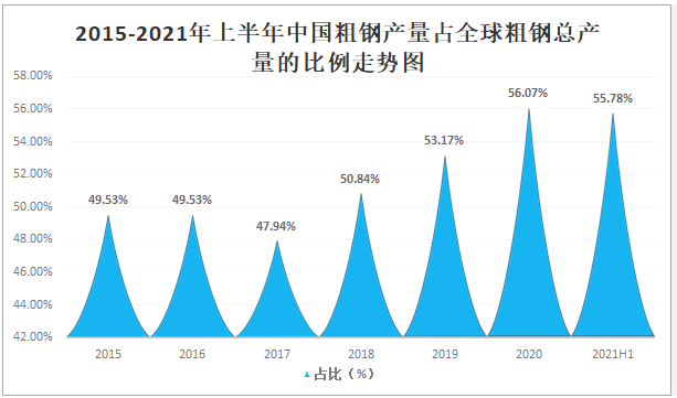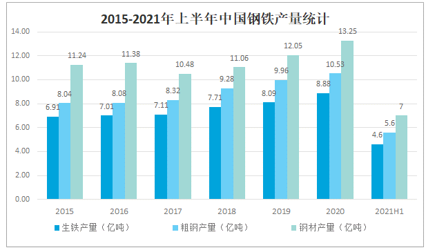鋼鐵行業(yè)作為我國國民經(jīng)濟(jì)發(fā)展的支柱產(chǎn)業(yè),涉及面廣,產(chǎn)業(yè)關(guān)聯(lián)度高,向上可以延伸至鐵礦石、焦炭、有色金屬等行業(yè),向下可以延伸至房地產(chǎn)、汽車、船舶、家電、機(jī)械、鐵路等行業(yè)。鋼鐵工業(yè)發(fā)展好壞對我國國民經(jīng)濟(jì)的發(fā)展具有重要影響,2020年年中國生鐵產(chǎn)量達(dá)8.88億噸,較2019年增加了0.79億噸,2021年上半年中國生鐵產(chǎn)量已完成4.6億噸;2020年粗鋼產(chǎn)量達(dá)10.53億噸,較2019年增加了0.57億噸,2021年上半年中國粗鋼產(chǎn)量已完成5.6億噸;2020年鋼材產(chǎn)量達(dá)13.25億噸,較2019年增加了1.20億噸,2021年上半年中國鋼材產(chǎn)量已完成7億噸。2015-2021年上半年中國鋼鐵產(chǎn)量統(tǒng)計