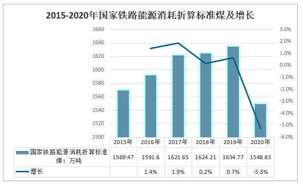 2015-2020年國家鐵路能源消耗折算標準煤及增長