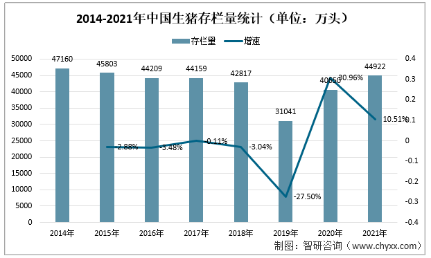 根據(jù)國家統(tǒng)計局數(shù)據(jù)顯示2014年-2021年間,除2019年因非洲豬瘟爆發(fā),中國生豬存欄量大幅減少到31041萬頭外,其他幾年中國生豬存欄量都在40000萬頭以上。非洲豬瘟爆發(fā)后,為促進豬肉穩(wěn)產(chǎn)保供,并最大限度消除2020年新冠疫情的疊加影響,國家頻頻出臺生豬產(chǎn)業(yè)扶持政策。2021年中國生豬存欄量提升至44922萬頭,同比增長10.51%。2014-2021年中國生豬存欄量統(tǒng)計(單位:萬頭)