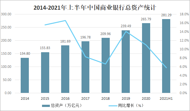 商業銀行是金融機構體系的重要組成部分,是中央銀行貨幣政策的首要傳遞者,更是現代社會經濟運轉的樞紐之一。近年來中國商業銀行總資產快速增長,2020年中國商業銀行總資產達265.79萬億元,較2019年增加了26.3萬億元,同比增長11.0%,2021年上半年中國商業銀行總資產已達281.29萬億元。