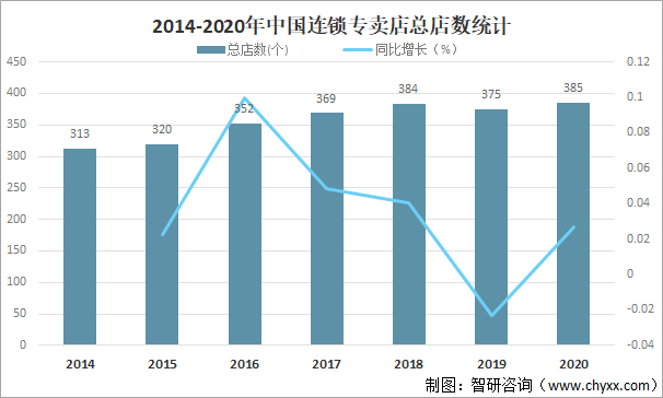 專賣店指的是專一經營某類行業相關的專營店。隨著社會分工的細化,各個行業都有自己的專賣店,而且越來越細化。各個行業中的專賣店,一方面滿足社會需求,一方面也提升企業各自的品牌。更重要的是,專賣店可以為企業研發的最新產品,第一時間讓客戶知道。從產品銷售直到售后服務,人們越來越習慣于專賣店中購物。總體來看中國連鎖專賣店總店數呈增長趨勢,2020年中國連鎖專賣店總店數達385個,較2019年增加了10個,同比增長2.67%。