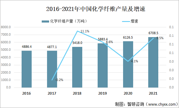2016-2021年中國化學纖維產量及增速