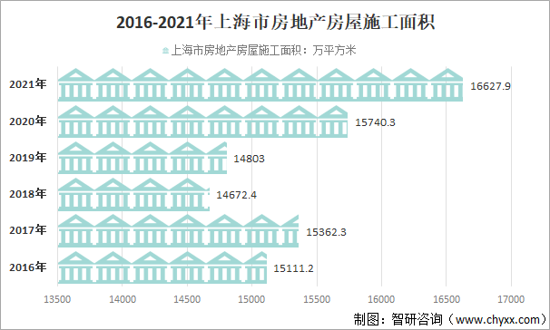 2021年,上海市房地產項目開工建設有序推進,房屋在建規模繼續擴大。上海市房屋施工面積16627.90萬平方米,較2020年增長5.6%。
