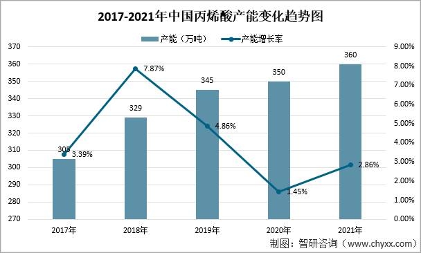2017-2021年中國丙烯酸產能變化趨勢圖
