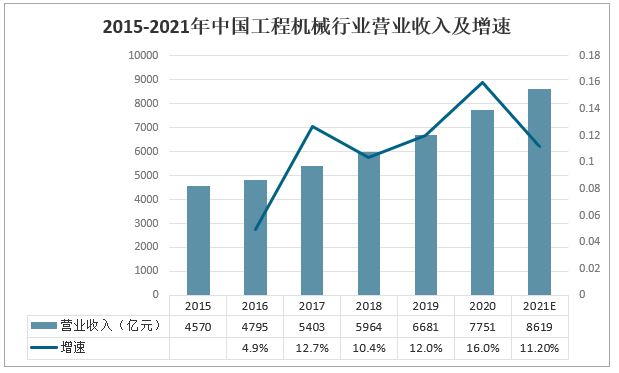2020年中國工程機械行業(yè)營業(yè)收入為7751億元,同比增長16%;隨著城鎮(zhèn)化、基建的需求量增加,預計2021年中國工程機械行業(yè)還有所增長。