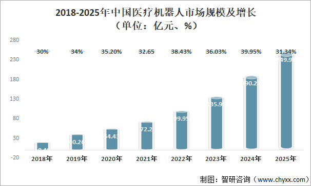 2018-2025年中國醫療機器人市場規模及增長(單位:億元、%)