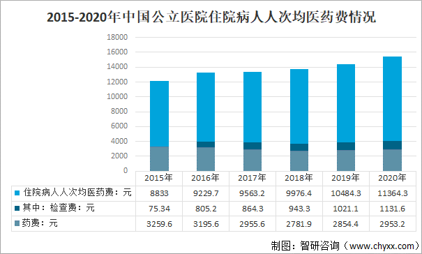從公立醫院住院病人人次均醫藥費來看,2020年中國公立醫院住院病人人次均醫藥費11364.3元,較2019年增長880元,其中:藥費2953.2元,占住院醫藥費的26.0%;檢查費1131.6元,占住院醫藥費的10.0%。