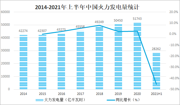 電力行業是關系國計民生的重要基礎行業,不僅日常生活中離不開電,支撐國家發展的三大產業更是離不開電力的支持,目前火力發電仍然是中國主要的發電方式,是電力生產的主力軍,2020年中國火電發電量達51743億千瓦時,較2018年增了1293億千瓦時,同比增長2.6%,2021年上半年中國火電發電量已完成28262億千瓦時。2014-2021年上半年中國火電發電量統計