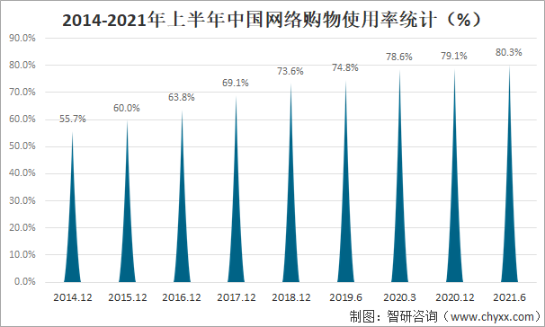 受疫情影響,2020年中國網絡購物用戶規模快速增長,截止2021年6月中國網絡購物用戶規模已達78241萬人,其中手機網絡購物用戶規模達78058萬人,龐大的用戶群體為中國網絡購物行業的發展提供了扎實的基礎。2014-2021年上半年中國網絡購物用戶規模統計