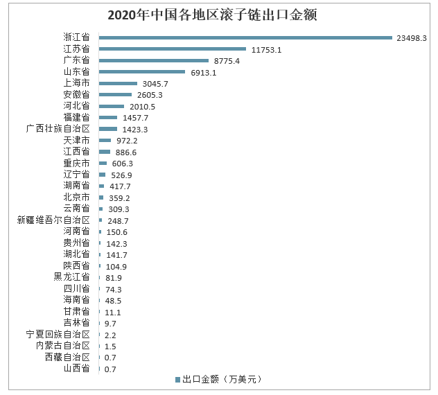 中國滾子鏈出口主要集中在浙江省、江蘇省、廣東省等地,其中浙江省、江蘇省滾子鏈出口金額超過1億元,2020年浙江省滾子鏈出口金額為23498.3萬美元;江蘇省滾子鏈出口金額為11753.1萬美元;廣東省滾子鏈出口金額為8775.4萬美元。2020年中國各地區滾子鏈出口金額