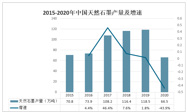 天然石墨自然界天然形成的石墨,一般以石墨片巖、石墨片麻巖、含石墨的片巖及變質(zhì)頁(yè)巖等礦石出現(xiàn)。2020年中國(guó)天然石墨產(chǎn)量為66.5萬(wàn)噸,同比下降43.9%。2015-2020年中國(guó)天然石墨產(chǎn)量及增速