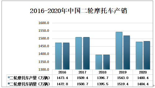 隨著社會經濟的快速發展,全國機動車保有量迅速增長,二輪摩托車逐漸成為人們的一種交通工具。2020年中國二輪摩托車產量為1480.4萬輛,同比下降4.1%;中國二輪摩托車銷量為1484.4萬輛,同比下降2.3%。