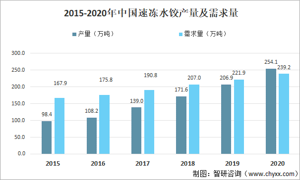 2020年中國速凍水餃產量約為254.1萬噸,同比增長22.8%;2020年中國速凍水餃需求量為239.2萬噸,同比增長7.8%。