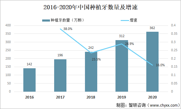 2016-2020年中國種植牙數量及增速