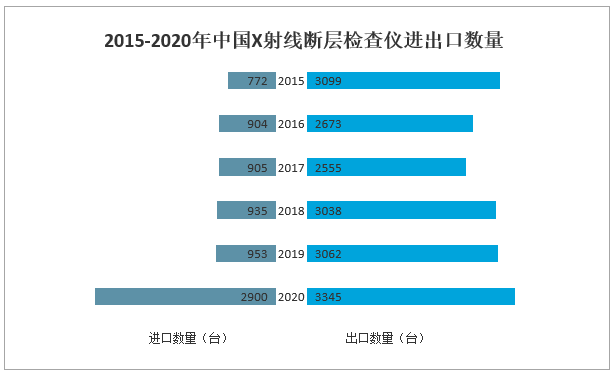 受疫情影響,2020年中國X射線斷層檢查儀進口數量增加至2900臺,同比增長204.3%;X射線斷層檢查儀出口數量為3345臺,同比增長9.2%。