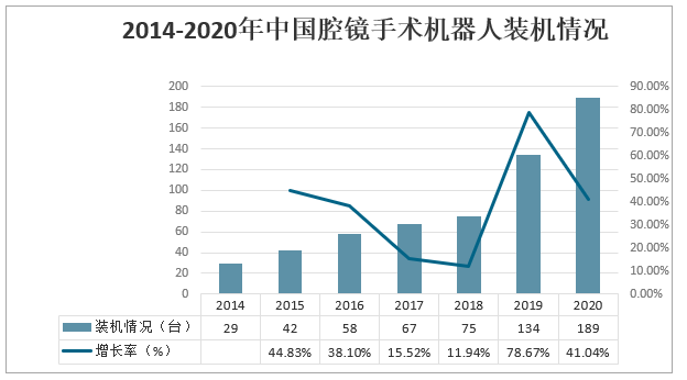 2006年12月20日中國人民解放軍總醫院引進第一臺達芬奇手術機器人,截止2020年底全國累計裝機189臺, 2014~2018年新增在10臺左右,2019、2020年呈現爆發式增長,分別為59、54臺。預計2021年開始年新增有望超過100臺,參考美國2020年3720臺保有量(年凈增200臺以上),我國未來手術機器人裝機量還有很大的空間。2014-2020年中國腔鏡手術機器人裝機情況