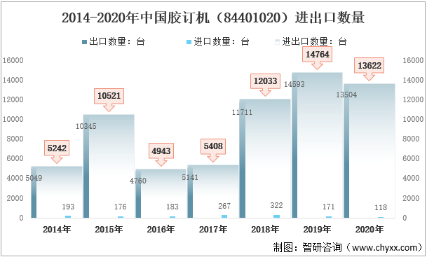 2020年中國膠訂機(84401020)進出口數量13622臺,較2019年減少1142臺。其中:出口數量13504臺,較2019年減少1089臺;進口數量118臺,較2019年減少53臺。2014-2020年中國膠訂機(84401020)進出口數量