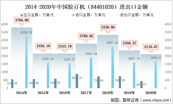 2014-2020年中國膠訂機(84401020)進出口金額
