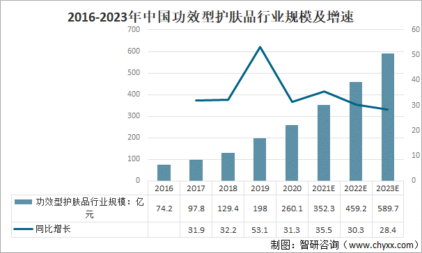 2016-2023年中國功效型護(hù)膚品行業(yè)規(guī)模及增速