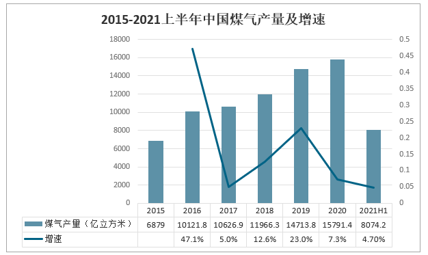 2015-2021上半年中國煤氣產(chǎn)量及增速