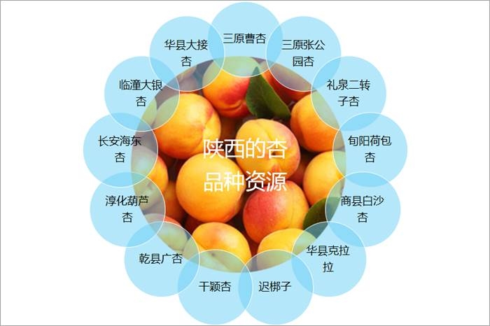 杏原產我國,陜西是原產地和主產省之一。由于自然條件適宜杏樹生長,所以在省內分布廣泛,品種資源豐富。陜西杏品種和類型約有400多個,其中約有350個是當地原產。許多是國內外著名的豐產優質良種。著名的有華縣大接杏、臨潼大銀杏、長安海東杏、三原曹杏、三原張公園杏、禮泉二轉子杏、旬陽荷包杏、商縣白沙杏,淳化葫蘆杏、乾縣廣杏、華縣克拉拉、遲梆子和干穎杏等。其中,華縣大接杏、三原張公園杏和禮泉二轉子杏是優良的大果型資源,華縣大接杏是優良的半矮化資源,旬陽荷包杏是優良的早熟大果型資源,華縣克拉拉杏是優良的仁用杏資源,商縣白沙杏是優良的加工杏品種,此外還從新疆、甘肅等省區引進了許多優良品種,如蘭州大接杏、唐王川大接杏和阿克西米西等。