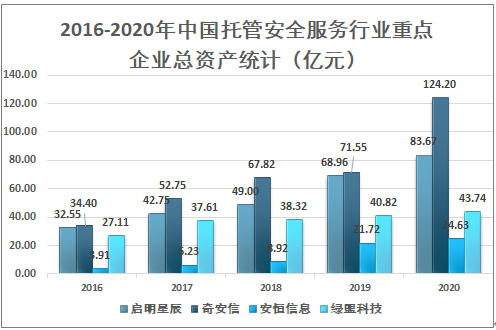 2020年啟明星辰總資產為83.67億元,較2019年增加了14.71億元;奇安信總資產為124.2億元,較2019年增加了52.65億元;安恒信息總資產為24.63億元,較2019年增加了2.91億元;綠盟科技總資產為43.74億元,較2019年增加了2.92億元。