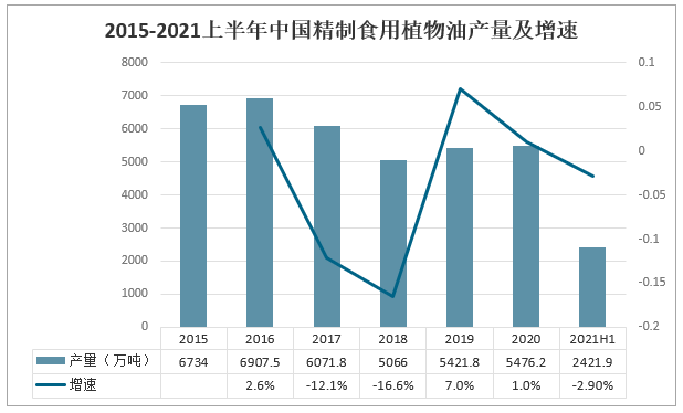 2015-2021上半年中國精制食用植物油產量及增速